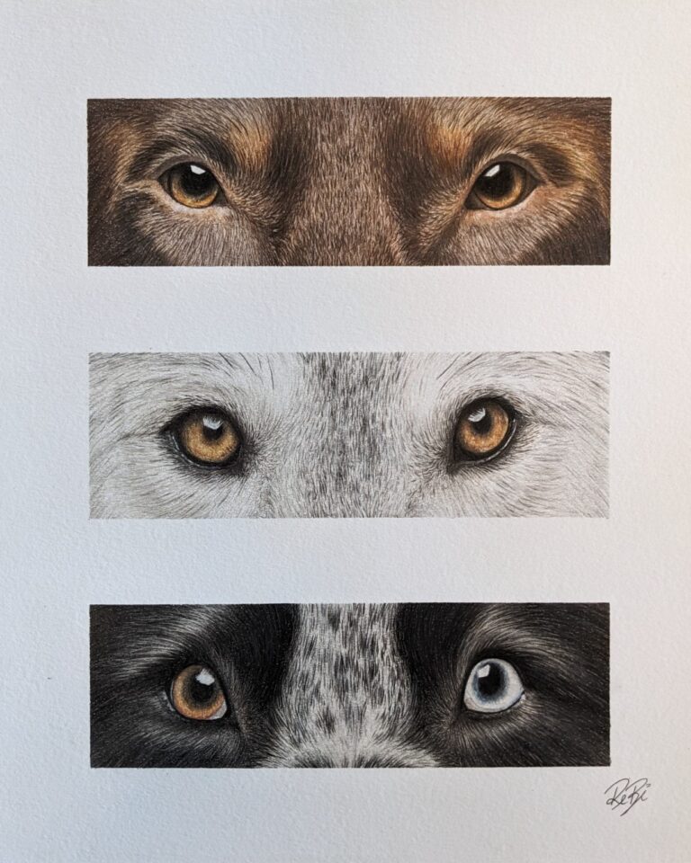 Ich fertige detaillierte, realistische Zeichnungen von Tieren, wie zum Beispiel Hunde und Katzen, an. Dafür verwende ich hochwertige Buntstifte (Fabercastell Polychromos, Caran D’ache Luminance Pencils) und Papier (Fabriano Aquarell Artistico paper hot pressed), die es mir ermöglichen, bei jedem handgezeichneten Porträt ein hohes Maß an Detailgenauigkeit zu erreichen.